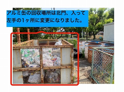 ☆アルミ缶の回収場所の変更について☆ アルミ缶の回収場所が変更になりました。新しい回収場所は北門入って左手のコンテナ(下の写真の赤い部分)になります。本年度もアルミ缶回収のご協力をよろしくお願いします。