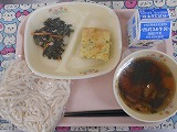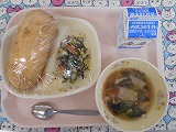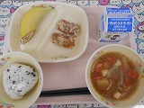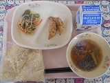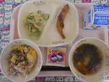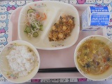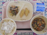 3月13日(金) ジョアストロベリー カツカレー 花野菜のサラダ 今日の給食は、チキンカツに カレーをかけて食べる カツカレーライスです。 カツの衣がカリカリで 食欲をそそります。 野菜も残さず食べましょう。  3月12日(木) 牛乳 スクールメロンパン 焼きウインナー キャベツとチーズのサラダ スパゲッティナポリタン 今日は木曜日、パンの日です。 メロンパンが出ています。 今年度の給食もあと5回となります。 味わって(^^♪いただきましょう。  3月11日(水) 牛乳 わかめご飯 竹輪の石垣揚げ 豚汁 バナナ 今日は防災給食です。 3月11日は東日本大震災が起こった日です。 被災された方の為に、全国各地から 支援が届きボランティアの人たちによる おむすびの炊き出しが行われ 被災地の方々を大いに助けたといいます。 今日はごはんカップにラップをかけて その中にわかめご飯をいれて ふんわりつまんで転がして 丸くなったものをにぎります。 お皿も汚さずにおにぎりが食べられます。 被災された方のことを思いやりながら もしもの時に備えて自分でおにぎりを にぎれるようになりましょう。  3月10日(火) 牛乳 肉うどん ほうれん草とひじきのサラダ ふっか野菜のパンケーキ 今日の給食は新メニューの パンケーキです。 深谷の特産物「ねぎとブロッコリー」を 使用しています。 ねぎ、ブロッコリーの他にも チーズ、ベーコン、黒コショウが入って おかずにもなるパンケーキです。  3月9日(月) 牛乳 うま煮丼 ワカサギフリッター 野菜のミックスサラダ 今日の給食は、野菜と豚肉、 いか、あさりが入った うま煮丼です。 ご飯の上にかけて食べます。 箸を上手に使って食べましょう!  3月6日(金) 牛乳 ごはん 鰆のマヨネーズ焼き キャベツのペペロンチーノ風 味噌けんちん汁 今日の給食は、魚へんに春と書いて さわらです。鰆のマヨネーズ焼きです。 春の訪れを感じさせます。 マヨネーズとチーズの風味で 魚臭さも感じずにいただけます。  3月5日(木) 牛乳 きな粉揚げパン ツナとひじきのサラダ わんたんスープ 今日の給食は、 人気のメニュー「きな粉揚げパン」です。 きな粉は大豆を粉末にした、 タンパク質、食物繊維、イソフラボン が豊富な栄養価の高い食品です。 サラダも残さず食べましょう。  3月4日(水) 牛乳 ごはん 麻婆豆腐 もやしのナムル コーン入り華風スープ 今日の給食は、野菜のみじん切りが たっぷり入った麻婆豆腐です。 給食では、辛味を抑えた麻婆豆腐ですので 辛い物が苦手でも食べられます。 ごはんにかけて麻婆丼にしても おいしいですよ。(^^♪  3月3日(火) 牛乳 広東麺 揚げ餃子 大根とわかめのサラダ 今日の給食は、冬の食材「大根」を 使用したサラダです。 大根に含まれるジアスターゼが 炭水化物の消化を助けます。 野菜も残さず食べて 健康な体をつくりましょう。  3月2日(月) 牛乳 ちらし寿司 ししゃもフライ 春野菜のごまマヨ和え すまし汁 ひながし 今日の給食は、明日のひな祭りに向けた ひな祭りの行事食です。 ひな祭りは女の子の幸せや成長を願い 3月3日に行われるお祝いです。 残さず食べて、みんな元気に成長できるよう お祝いしましょう。  | 12345次 |