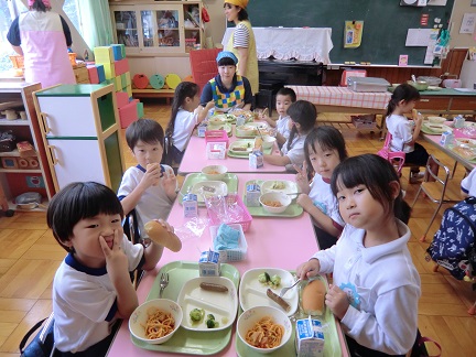 「野菜食べられるかなぁ…」と、心配していた子もいたようですが、食べ始めるととてもおいしくて、「こんなにたくさん食べちゃった!」「おかわりしてもいい??」と言いながら、たくさんの笑顔を見せてくれました。