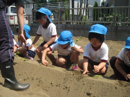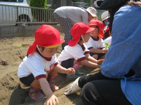 に植え方を教えてもらい、やってみるこどもたち。