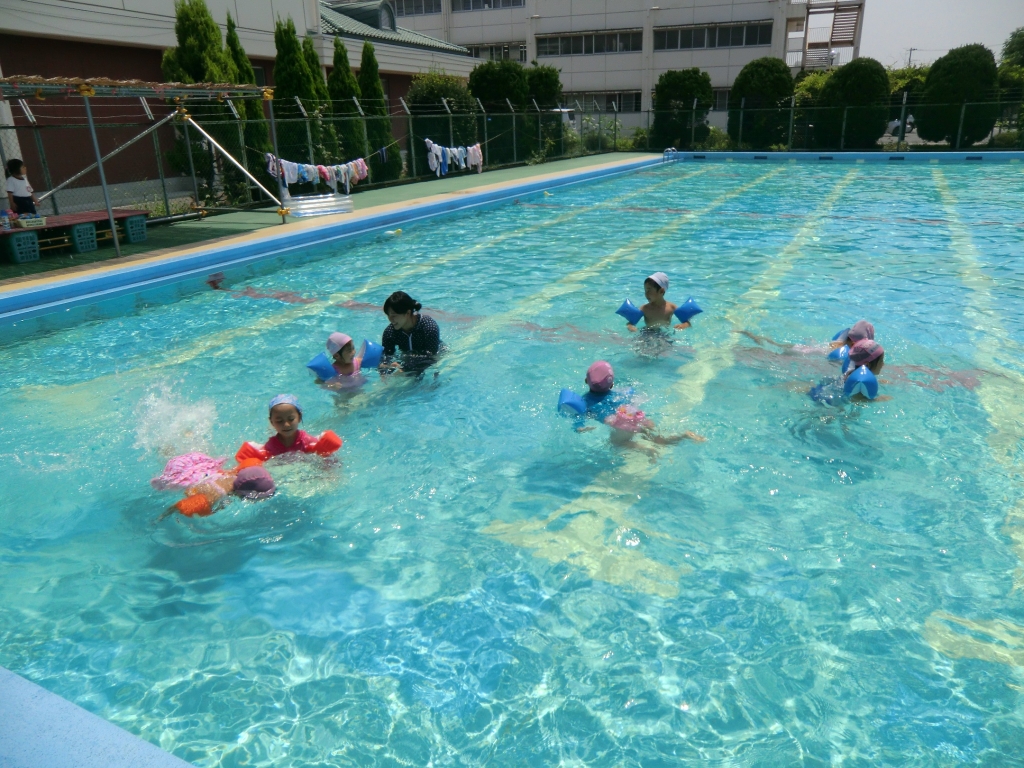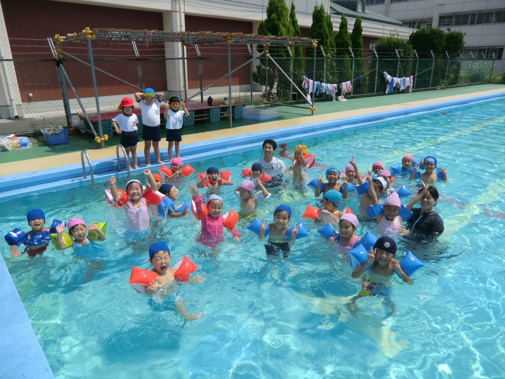 小学校の大きなプールはとっても気持ちよかったです。怖がる様子は全くなく、全員がのびのびと水遊びを楽しみました。