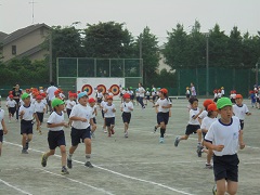 運動場を走って、身体をきたえています。