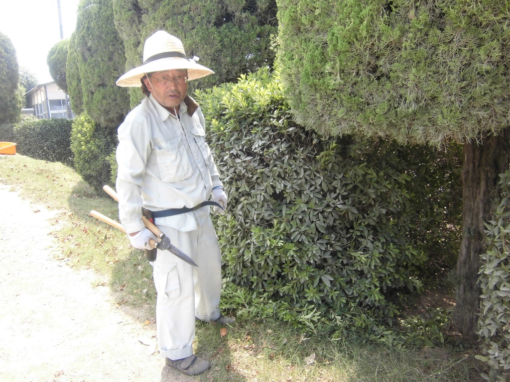 用務員の清水さんは、連日の猛暑にも関わらず、樹木の手入れや除草などを行っています。おかげで幡羅小はきれいです。