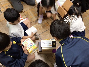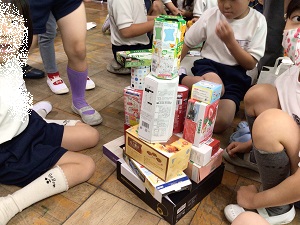 子どもたちは空き缶や空き箱を積み上げたり、転がしたりして、立体の図形に親しみました。グループごとに楽しみながら、学習することができました。