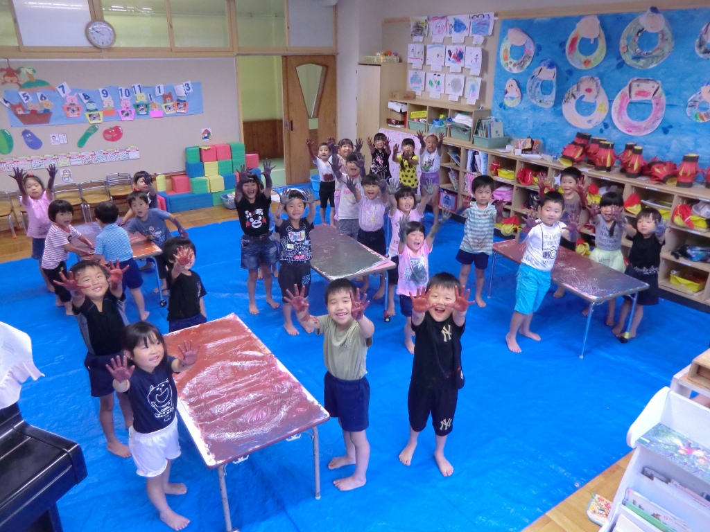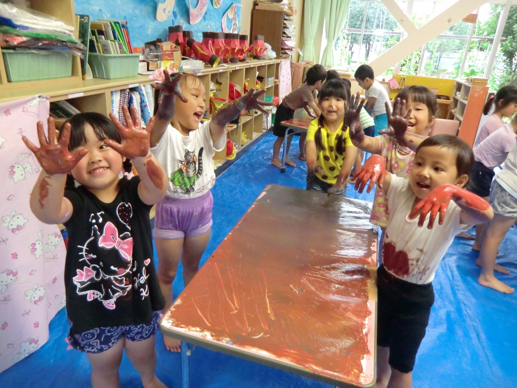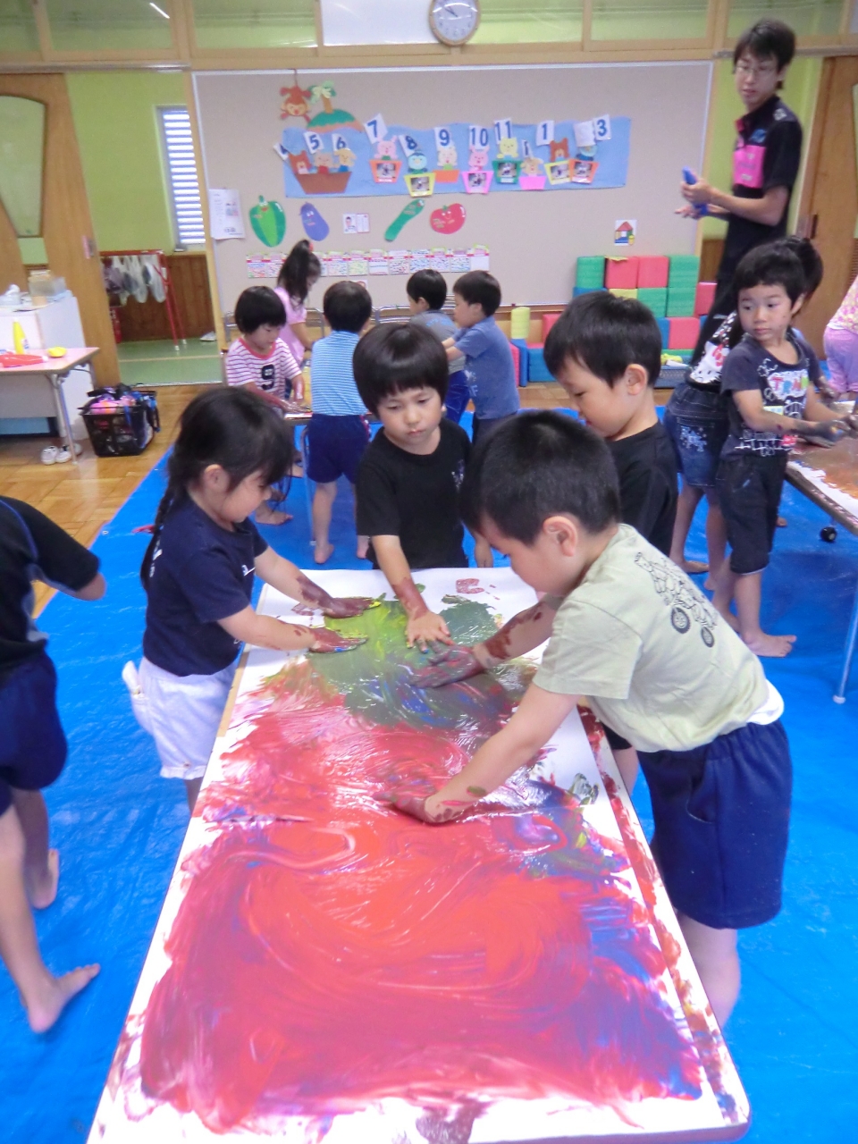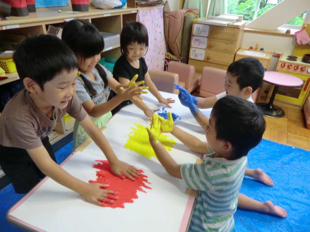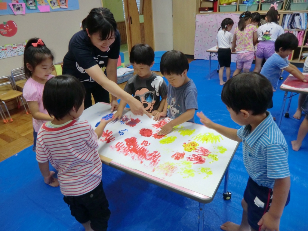 絵の具の感触や、色が混ざり合う不思議を楽しみながら遊びました。