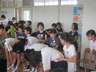 中学生とペアになって、体をほぐしたり、呼吸のしかたを教えていただいたり、発声練習をしたりして、ひびく声の出し方を勉強しました。