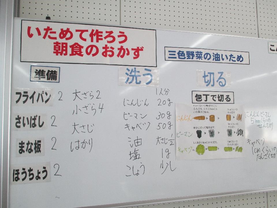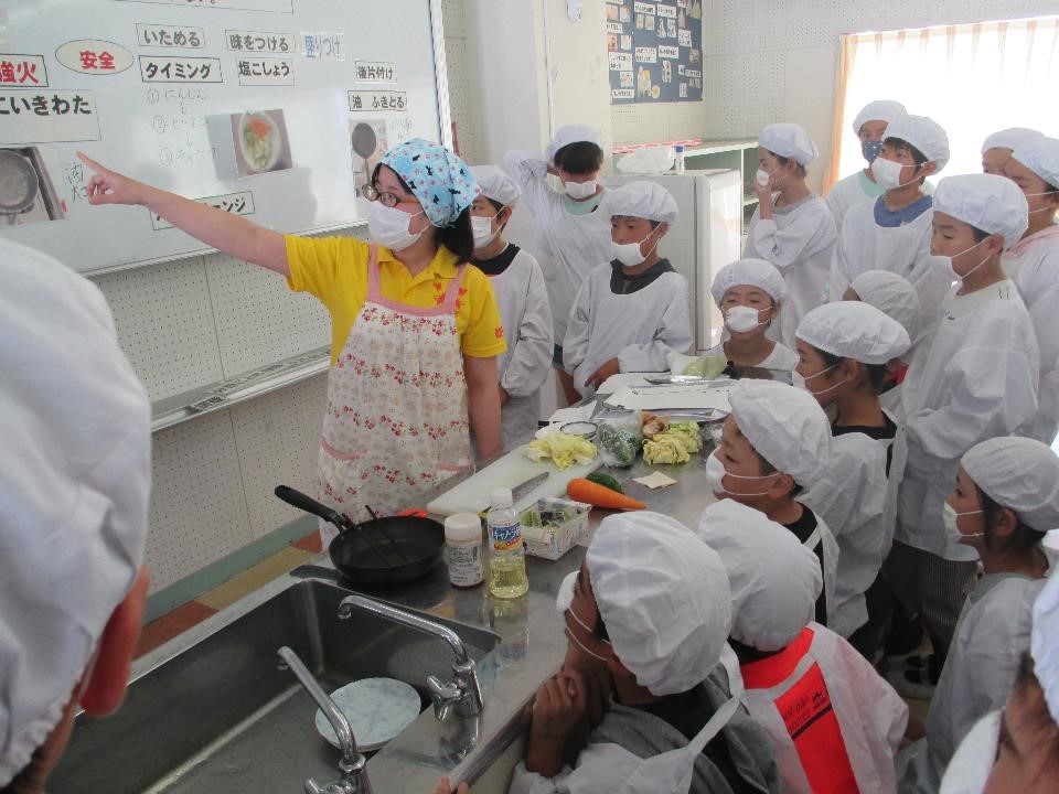 6年生の家庭科では、材料を炒めるという学習で「野菜炒めづくり」を行いました。野菜嫌いの児童も自分で作った野菜炒めは食べられました。