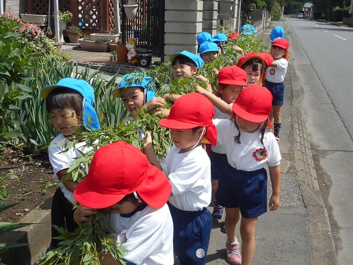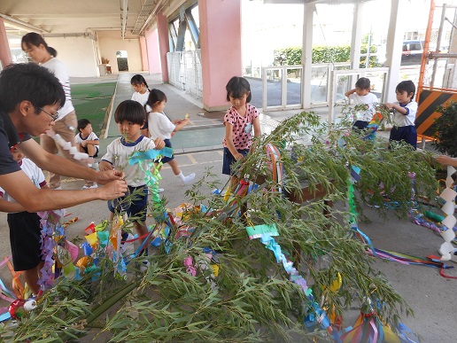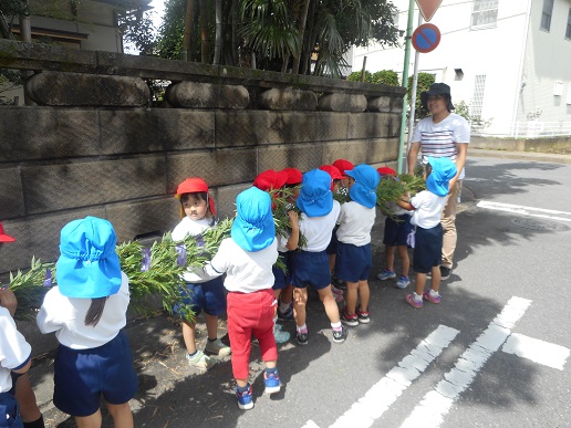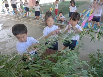 大きな竹にみんなびっくりしていましたが、全員で力を合わせて幼稚園まで運び、飾りつけをしました。小学校のお兄さんお姉さんにや先生たちに、「きれいだね。」「すごいね。」とたくさん声をかけてもらい、とても嬉しそうな子どもたちでした。