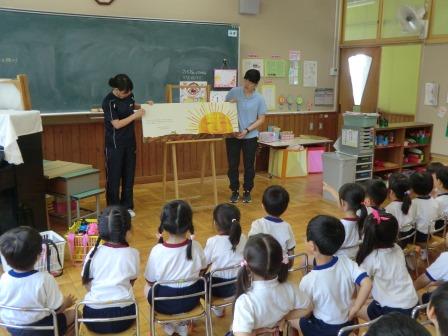 それから地震についての紙芝居を見て、楽しみながら地震があったときにはどうすればいいのか、みんなで話しました。