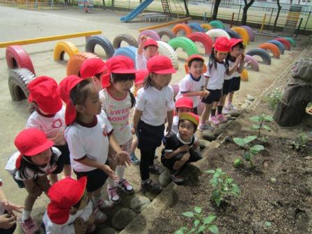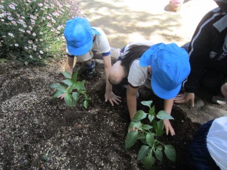 子どもたちがきれいにした花壇に野菜の苗を植えました。