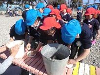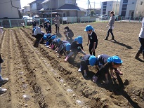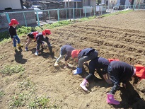 種芋の断面に灰をつけたり、肥料をまいたりしてから植えました。「どうしてこんなことをするの?」と疑問を持ち、畑の先生に教えていただきながら作業をしていました。