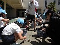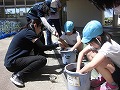 まず、バケツの中に土と水を入れ、しっかりと混ぜます。