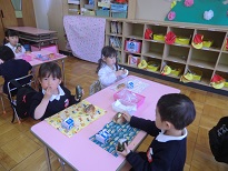 午前中たっぷりと遊んだ子どもたちはお昼にはおなかがペコペコ。給食の時間は「おいしいね。」「たのしいね。」と、うれしそうであふれていました。食後の歯磨きもとても上手にできました。
