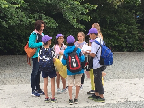 外国語の時間に学習したことを生かし、外国の方にインタビューしています。 自分たちの英語が通じて、とても嬉しそうです!