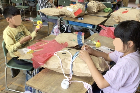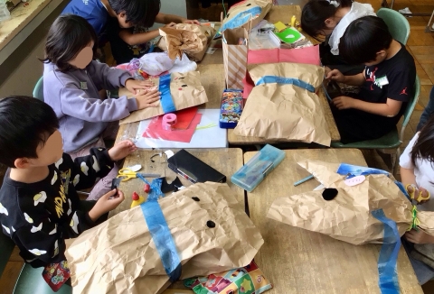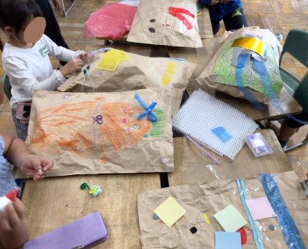 袋の形や材料の使い方を工夫して楽しみながら作っており、完成した「お友だち」にお愛着が沸いている様子でした。