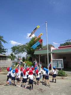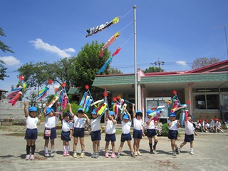 では、自分のこいのぼりとクラスみんなで力を合わせて大きなこいのぼりを作りました。大きなこいのぼりは空高く気持ちよさそうに泳ぎました。
