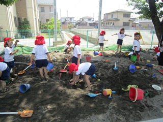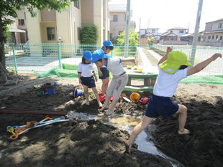 最近では、砂遊びに夢中の子どもたち。水も使って元気いっぱい遊んでいます!