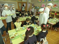 優しくて面白いお兄さんお姉さんにたくさんお世話していただきながら、おいしく楽しく給食をいただくことができました。
