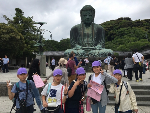 子供たちが続々と高徳院に到着し始めました。大きな大仏と記念撮影!