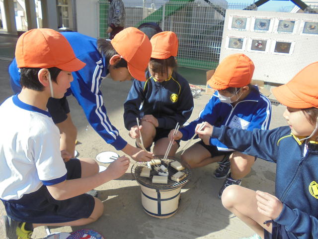 今日は七輪を使って火をおこし、もち焼き、ねぎ焼きの体験を行いました。