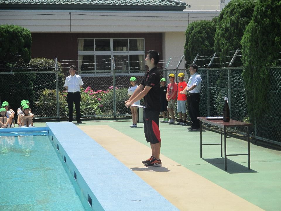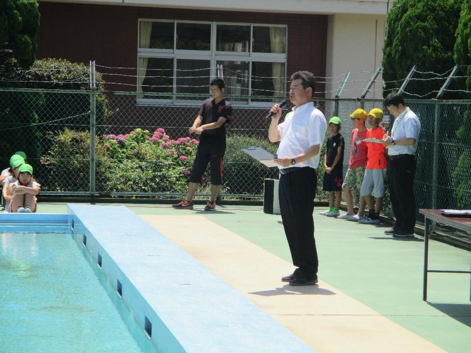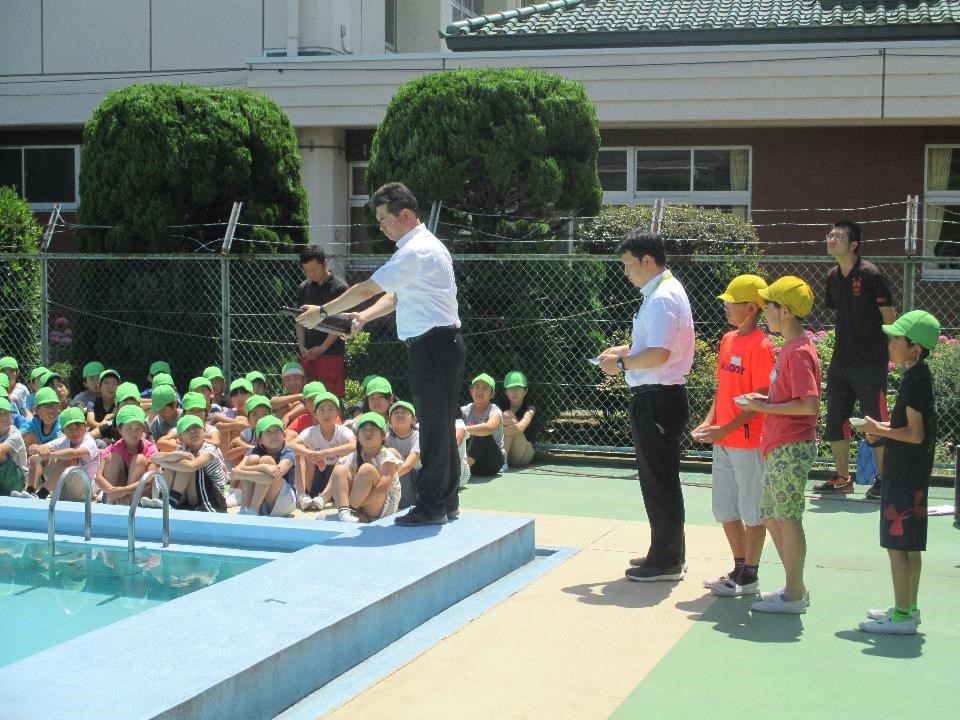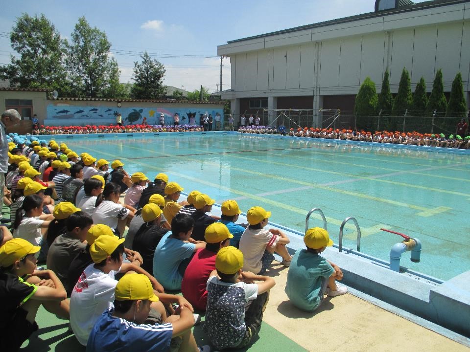 本日の業間時間にプール開きが行われました。本年度も安全にプールに入れるように全校でお清めしました。