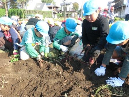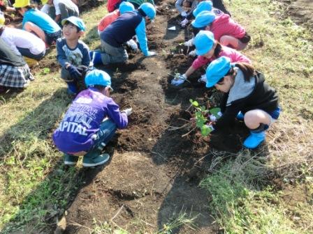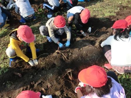 土が少し硬くて大変なところもあったけれど、たくさんのおいもが出てきて子どもたちは、大満足でした。 |
