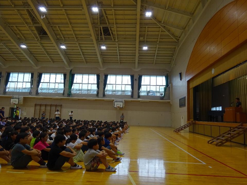 あいにくの雨でプールサイドではなく、体育館での実施でしたがみなさん集中して先生からの約束をきいていました。