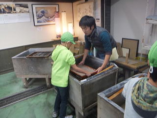 (仲良くみんなでお昼ご飯)     (初めての紙すき体験!)