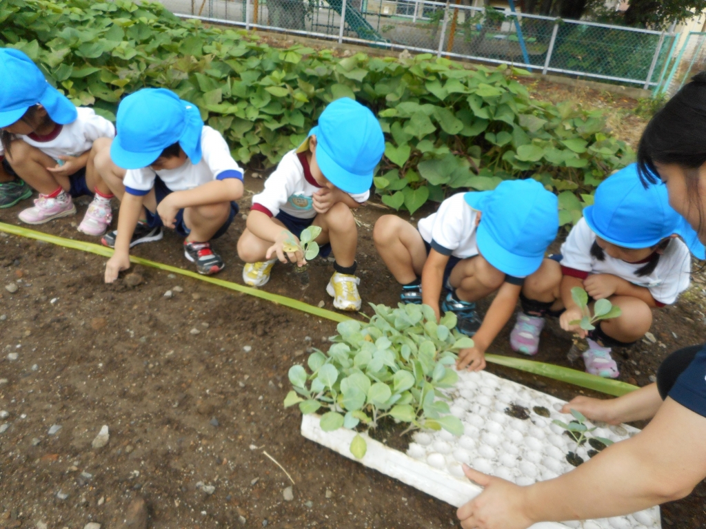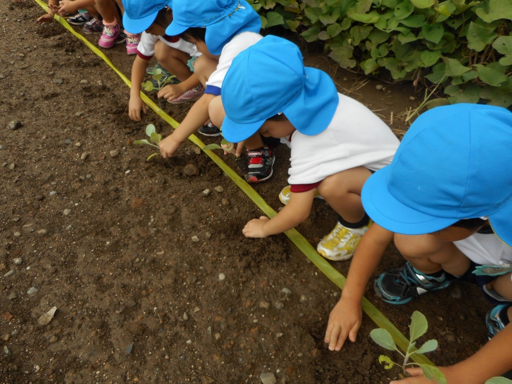 畑の先生に苗をいただき、キャベツの苗を植えました。