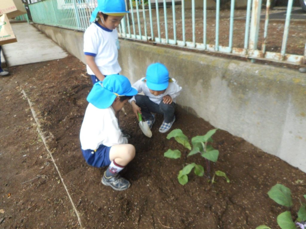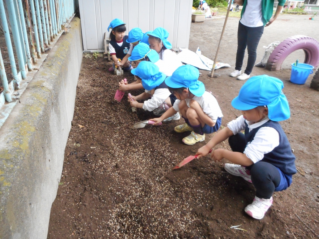 、年長さんが耕してくれた畑に一緒に植えさせてもらいました。