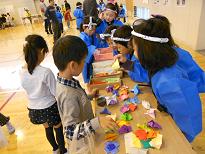 またそれぞれ工夫を凝らした15のお店も大成功。 1年生にていねいにルールを教えてあげる姿、小さな手をとって、一緒に折り紙を折ってあげるなど、やさしい2年生の姿も見られました。