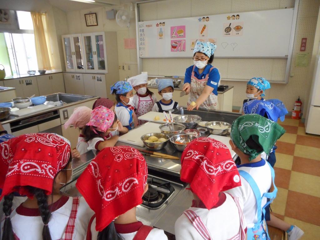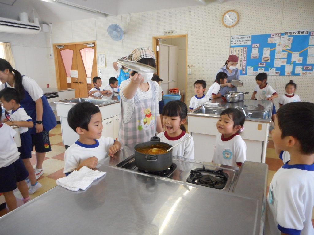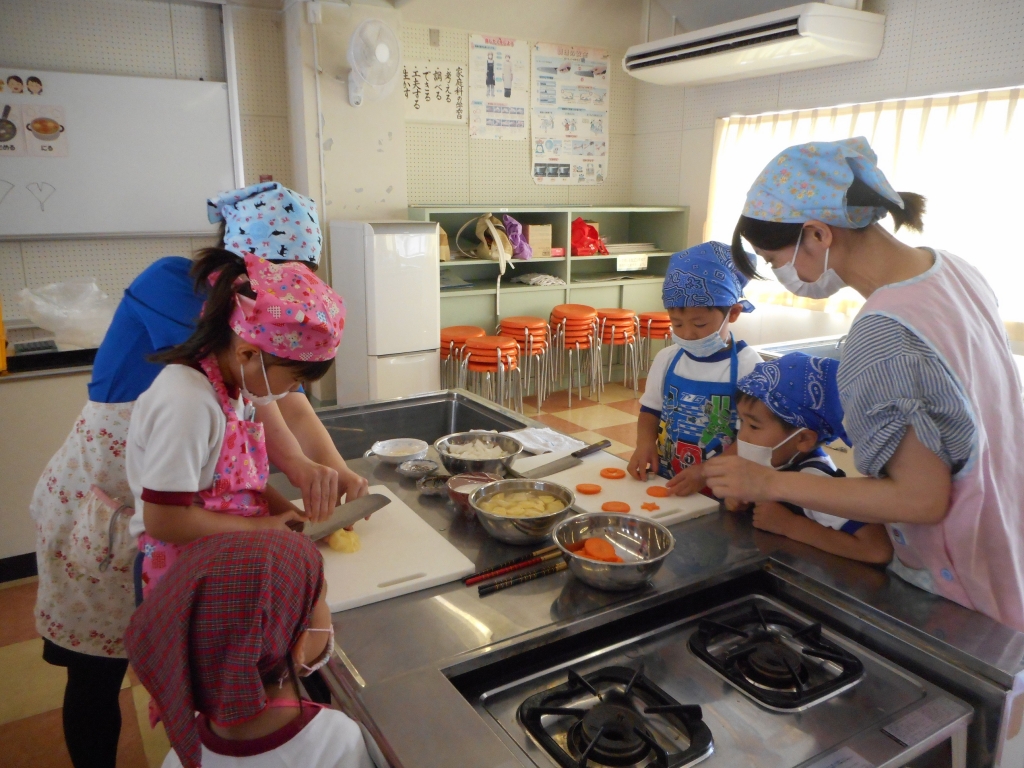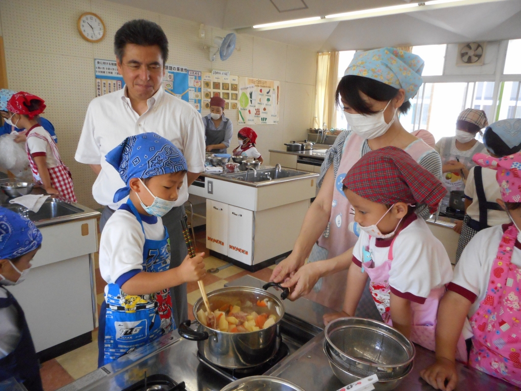 じゃがいもをいちょう切りにし、にんじんは型抜きをしました。材料をよく炒めて、煮込みました。出来上がった後、鍋のふたをとると、みんなの歓声とおいしい匂いが広がりました。